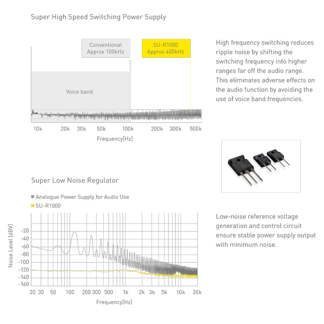 The SU-R1000 uses a switching power supply system to ensure a stable supply of voltage and current required by the digital amp. In a conventional switching power supply system, the ON time of the switching operation was controlled in order to stabilize the voltage, and this causes the switching frequency to fluctuate according to the load, resulting in a modulation noise to affect the sound quality. The Advanced Speed Silent Power Supply has eliminated this noise by fixing the switching frequency in the 400kHz band. Furthermore, a Super Low Noise Regulator is provided in the later stage. This prevents the decrease of regulation resulting from the fixed switching frequency and impedes the mixing of noise component into high frequencies. The result is a high-response power supply that results in the best performance from the digital amplifier.