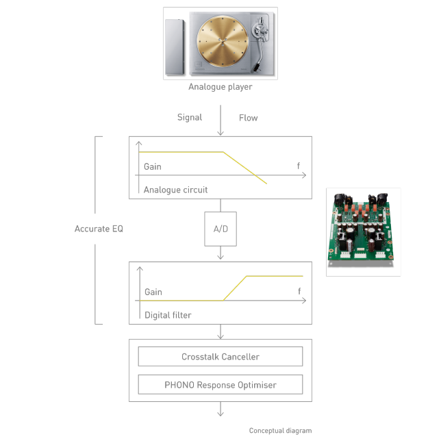 This function measures the frequency characteristics of the installed pickup cartridge by using a TSP (Time Stretched Pulse) signal recorded on the bundled Calibration Record, and corrects characteristics disturbance. It corrects the effect of impedance matching between the pickup cartridge and the phono equalizer to reveal the true sound quality of the cartridge. This technology aims to improve sound quality by avoiding a selector such as a switch in the high-sensitivity phono input line for the removal of the possibility of noise disturbance.
