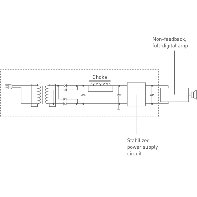 rectification, plus a discrete stabilized power supply circuit. These technologies incorporated in the power supply circuit enable the amp to drive the speakers powerfully under any conditions.