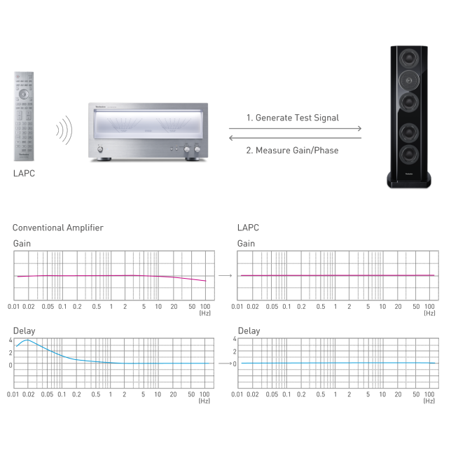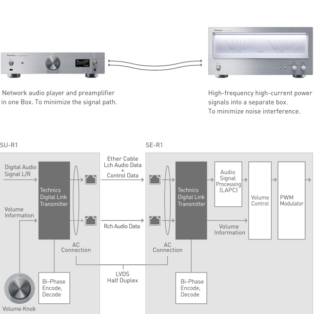 Some systems use a digital link between source component and pre-amplifier, keeping the digital signal pure as long as possible: Technics Digital Link goes further. It has eliminated the volume control function from the pre-amplifier, and instead transmits the volume control information, together with the audio signal, directly to the power amplifier in digital form. The power amp's jitter reduction circuit reduces any effect of jitter in signal transmission, then performs the volume control immediately before the PWM converter. This new sound transmission interface, Technics Digital Link, supports audio signals and also eradicates inter-channel effects by transmitting the left and right channel signals separately.