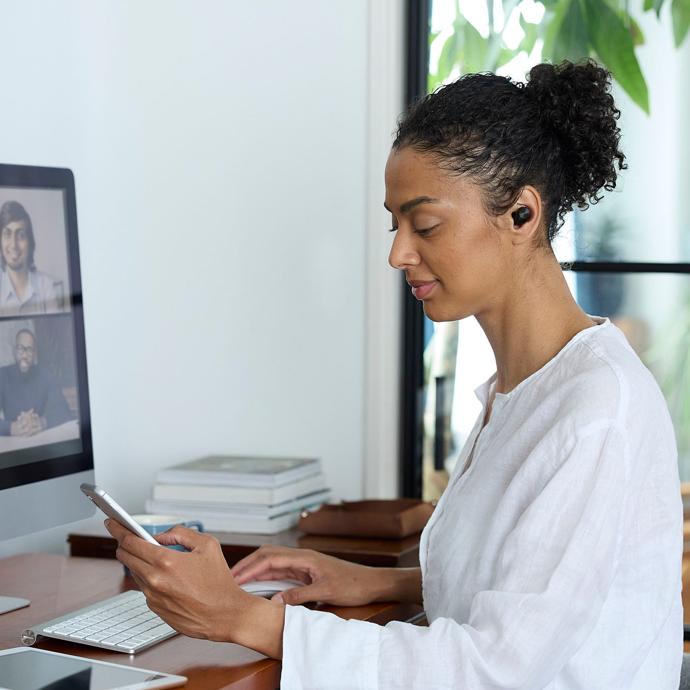 3-point multipoint connection lets you connect to 3 devices for smooth, professional multitasking. Plus, make and receive clear calls with beamforming technology, convenient single-earphone use,