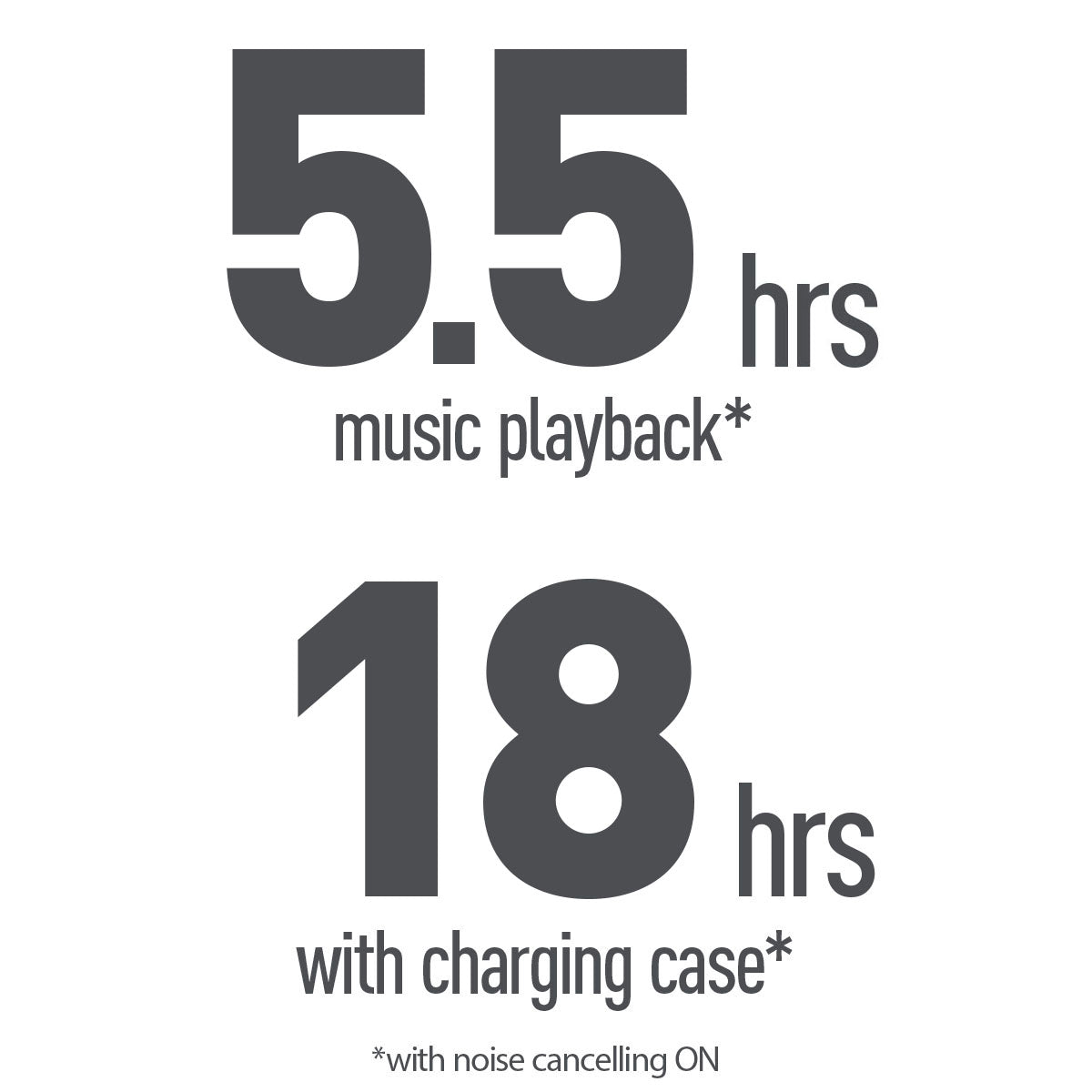 Up to 5.5 hours* playback with ANC on, 18 hours back-up with the case.