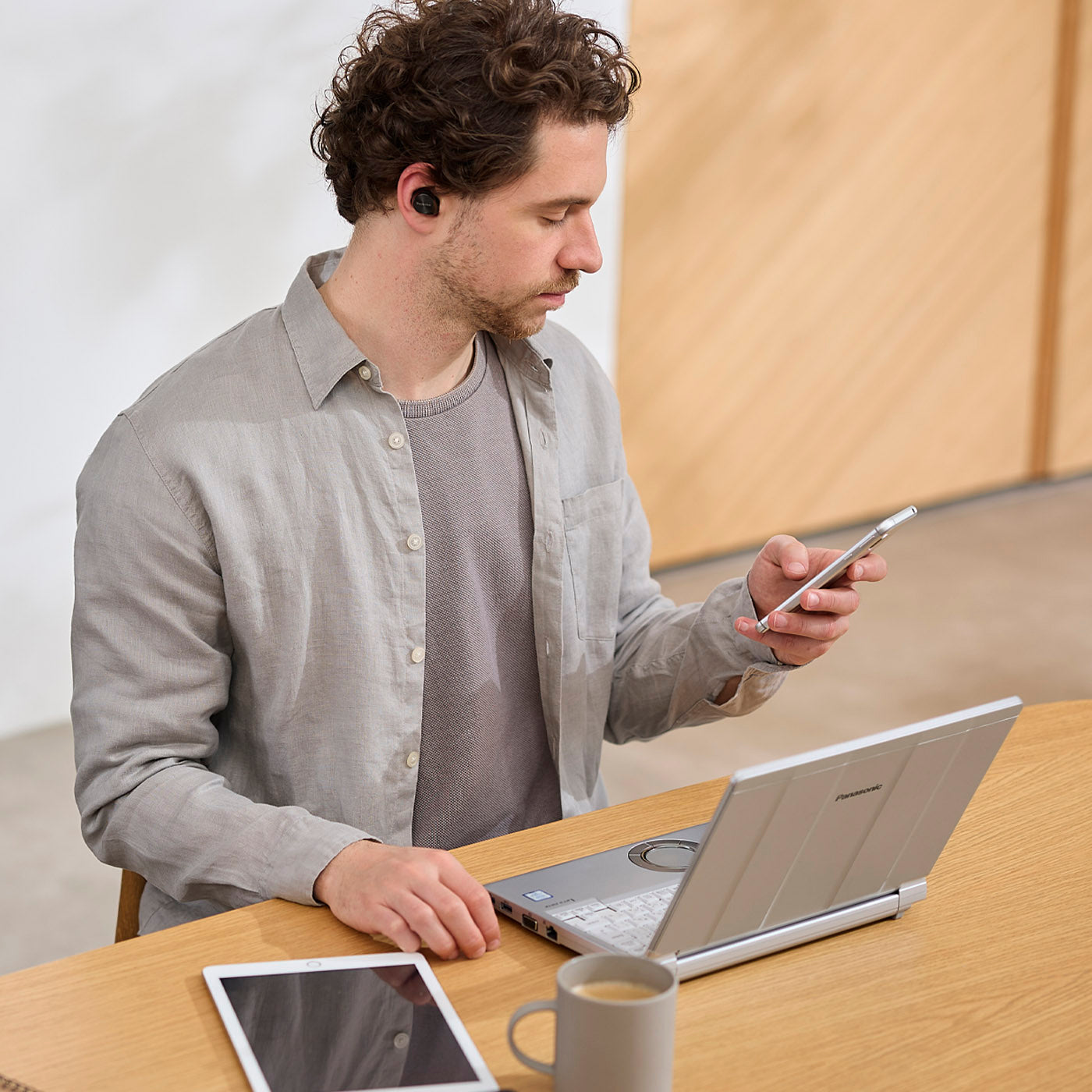 3-point multipoint connection lets you connect to 3 devices for smooth, professional multitasking. Plus, get crystal-clear call clarity with enhanced JustMyVoice™ technology, convenient single-earphone use, easier than ever sound control, and long battery life.